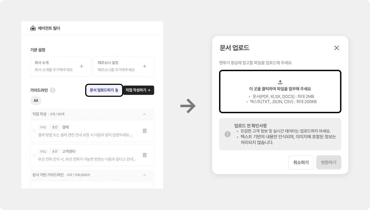 โ€˜๋ฌธ์„œ ์—…๋กœ๋“œโ€™๋Š” ๋ฌธ์„œ(ex.๊ณ ๊ฐ ์‘๋Œ€ ์ง€์นจ ๋งค๋‰ด์–ผ/์ •์ฑ…์„œ ๋“ฑ)๋ฅผ ์—…๋กœ๋“œํ•ด ์  ํˆฌ ๊ฐ€์ด๋“œ๋ผ์ธ์œผ๋กœ ๋ฐ”๋กœ ๋งŒ๋“ค์–ด ๋‚ด ์‡ผํ•‘๋ชฐ์— ๋งž๋Š” ์‘๋Œ€ ๊ธฐ์ค€๊ณผ ์šด์˜ ์ง€์นจ์„ ๋น ๋ฅด๊ฒŒ ์ ์šฉํ•  ์ˆ˜ ์žˆ๋Š” ๊ธฐ๋Šฅ์ด์—์š”.