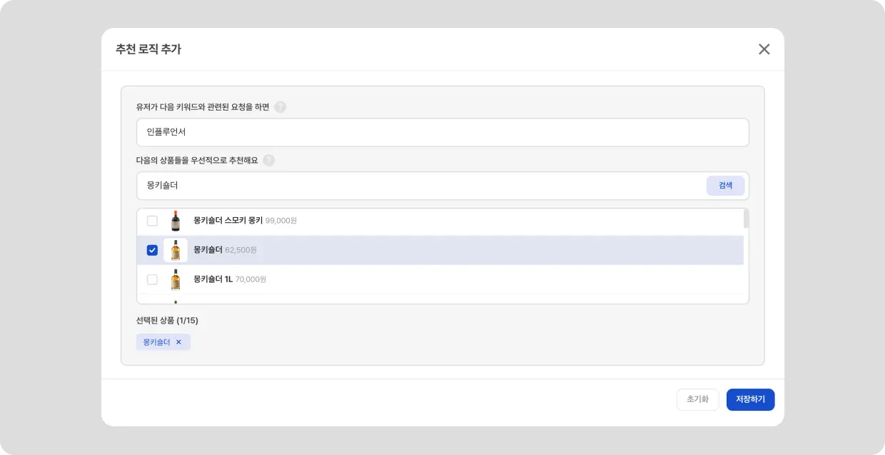 μ΄μ βμΆμ² λ‘μ§ μ€μ β κΈ°λ₯μ ν΅ν΄, ν€μλλ³λ‘ μΆμ² μνμ μ€μ ν΄ λ³΄μΈμ!